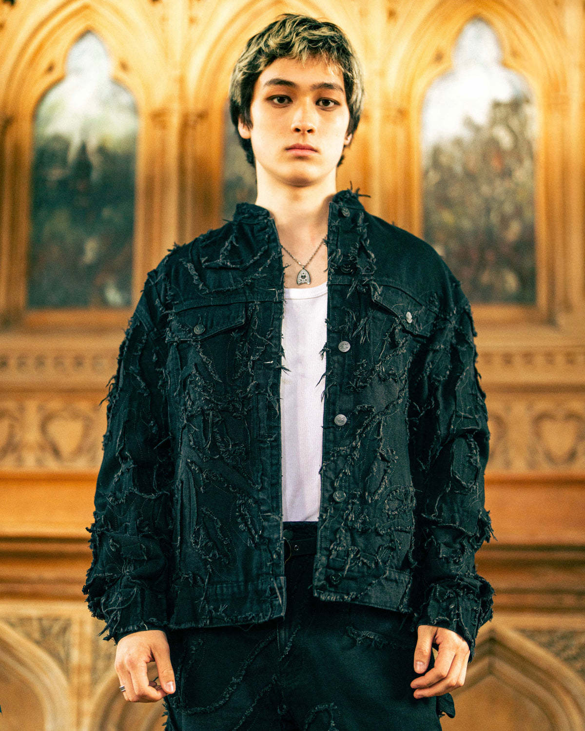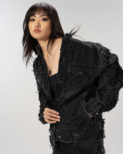 Distressed patchwork denim jacket