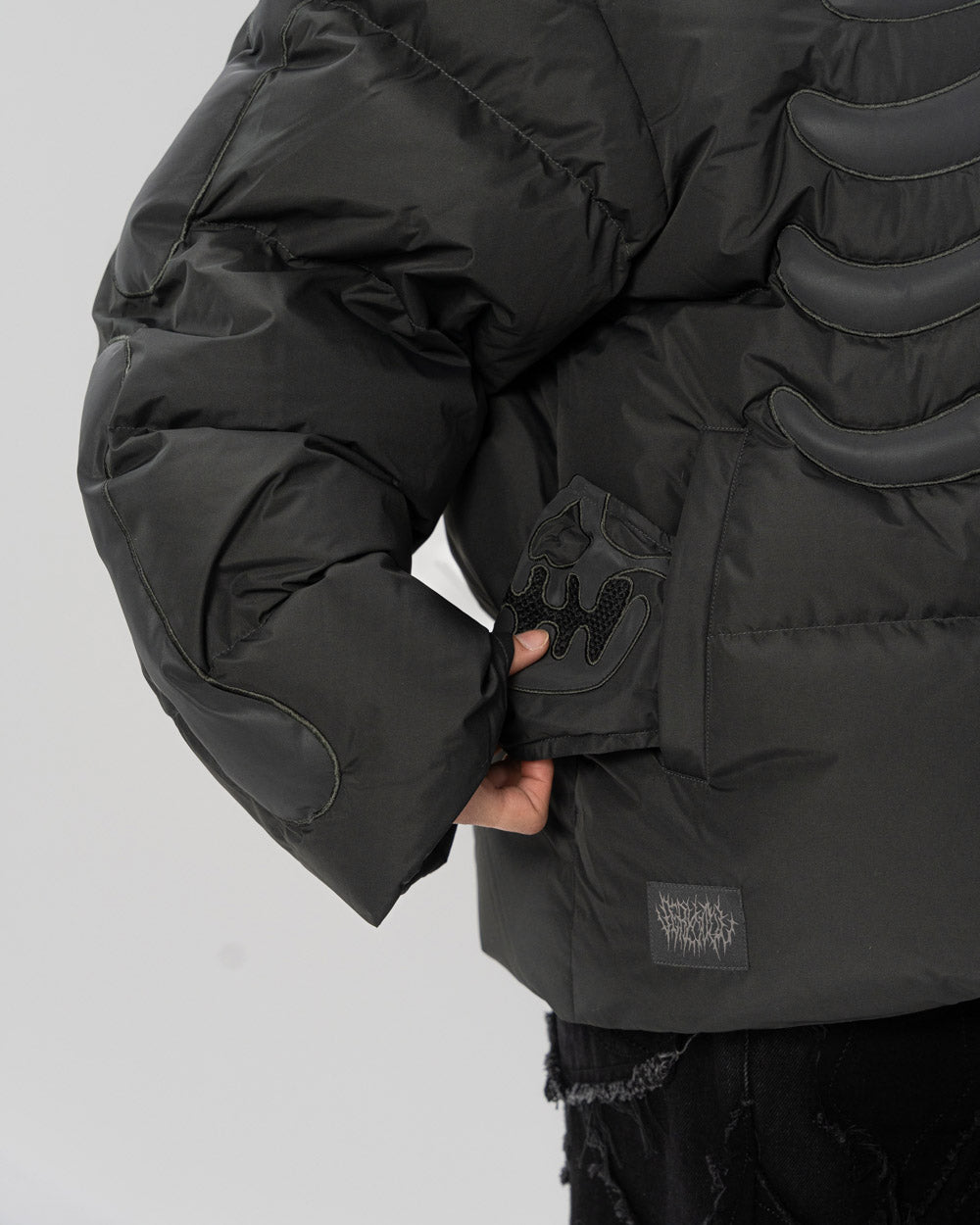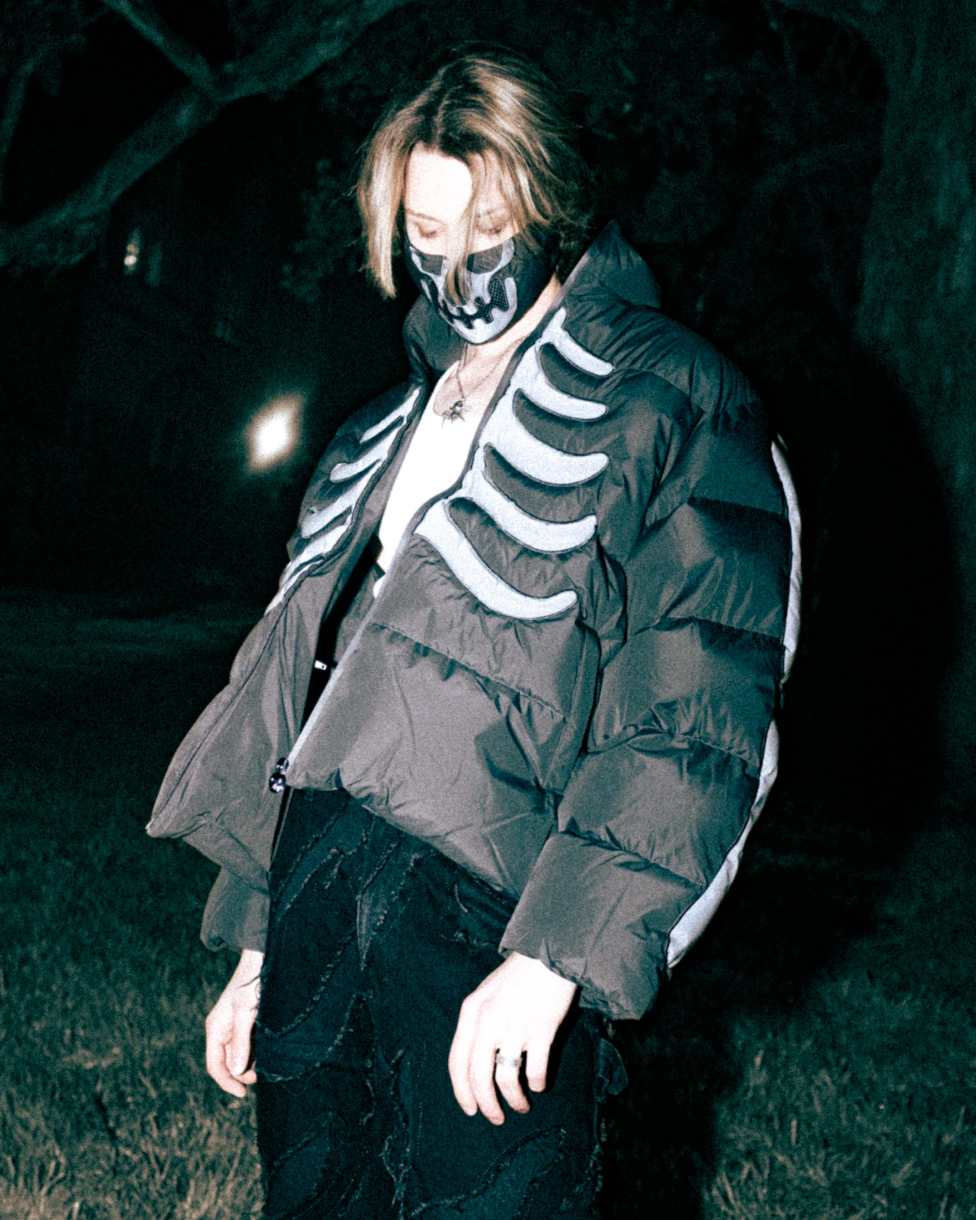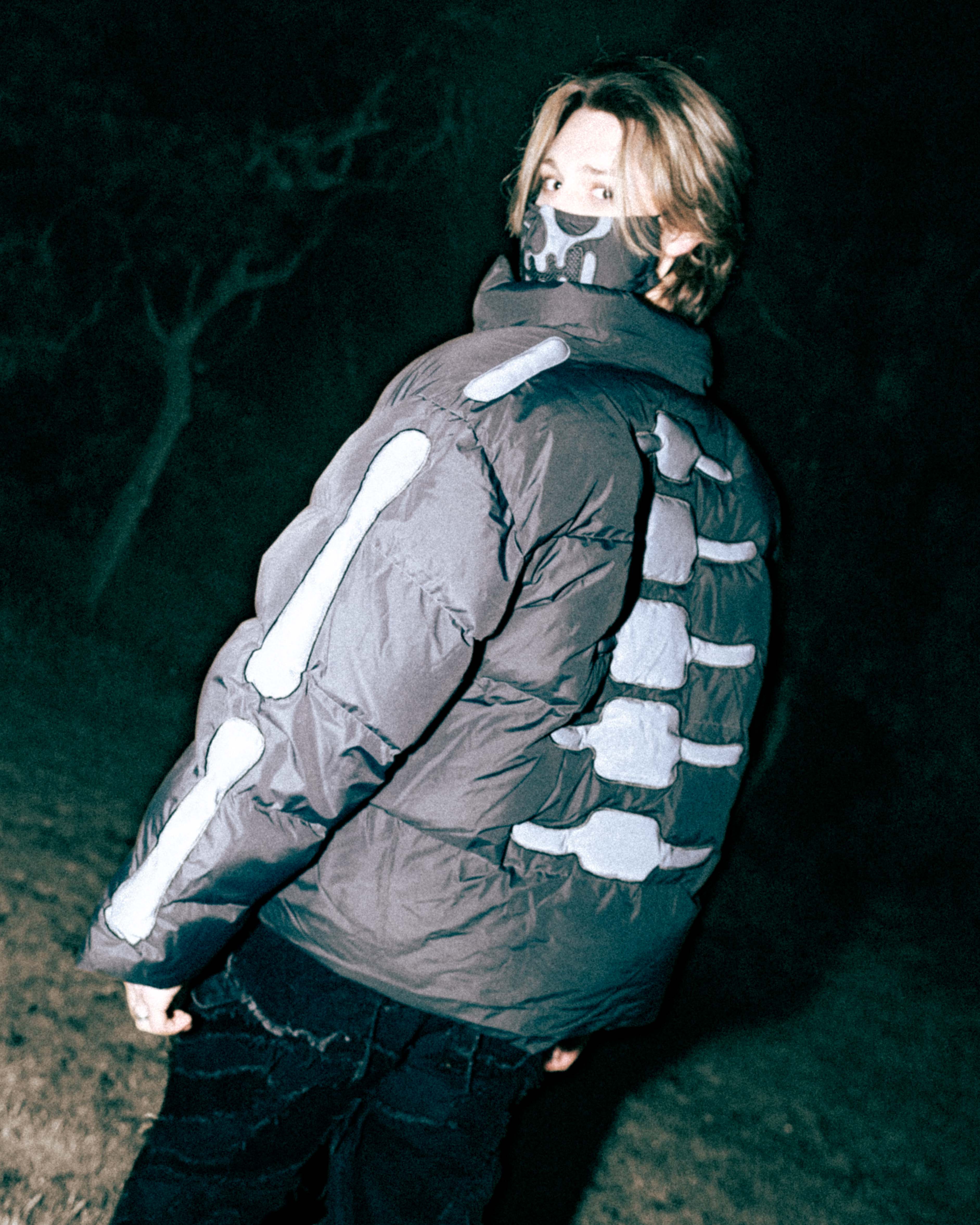 - Black reflective bone detail and custom skull zip pull